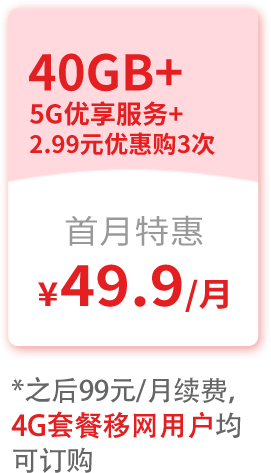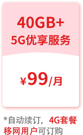 1、大流量:5G升级包99元/月,包含国内流量40GB。