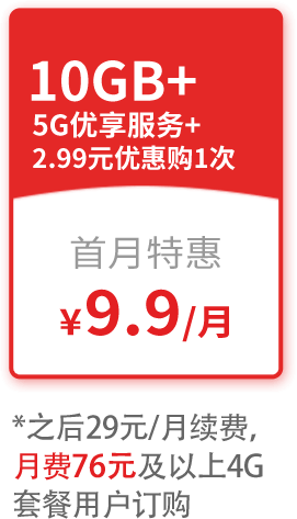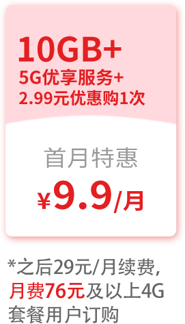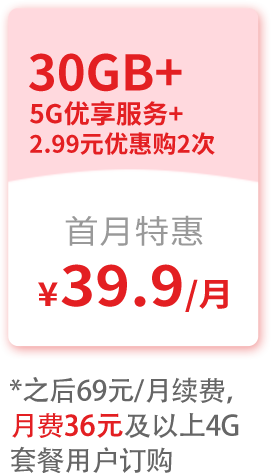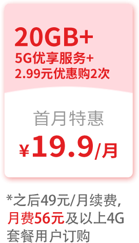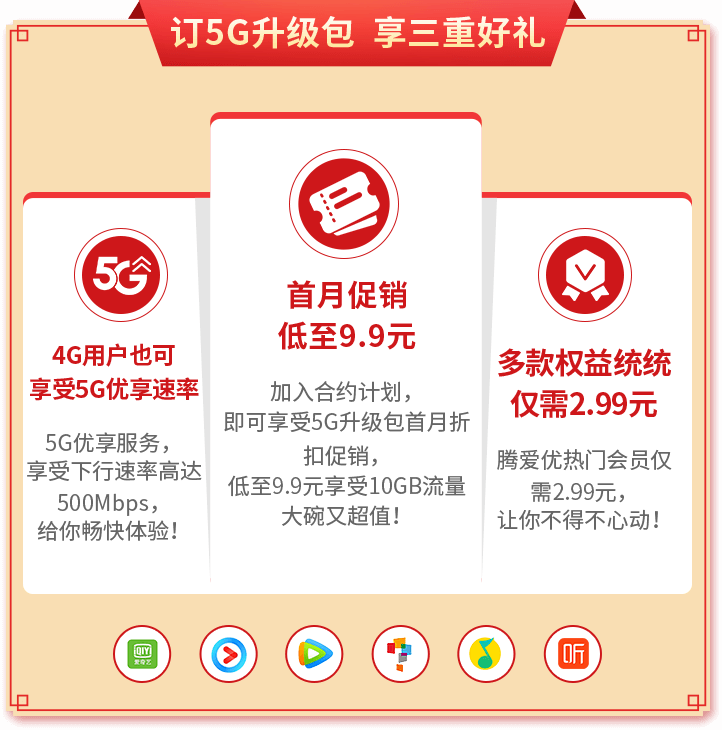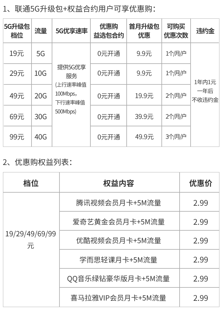 1)5G升级包首月折扣优惠,19元/29元/49元/69元/99元五档的月租费首月优惠为9.9元/9.9元/19.9元/39.9元/49.9元;