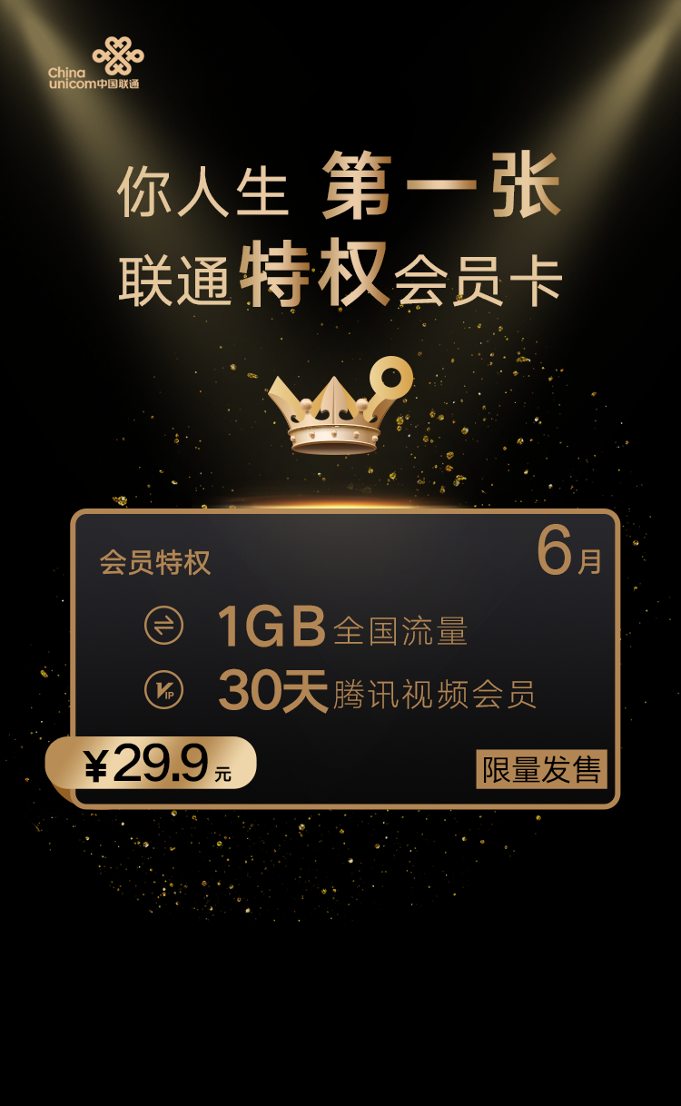 WO特权会员月卡每月推出不同主题的专属特权,6月会员专属特权包括1GB全国流量和30天腾讯视频会员,价格29.9元, 限购100万份。