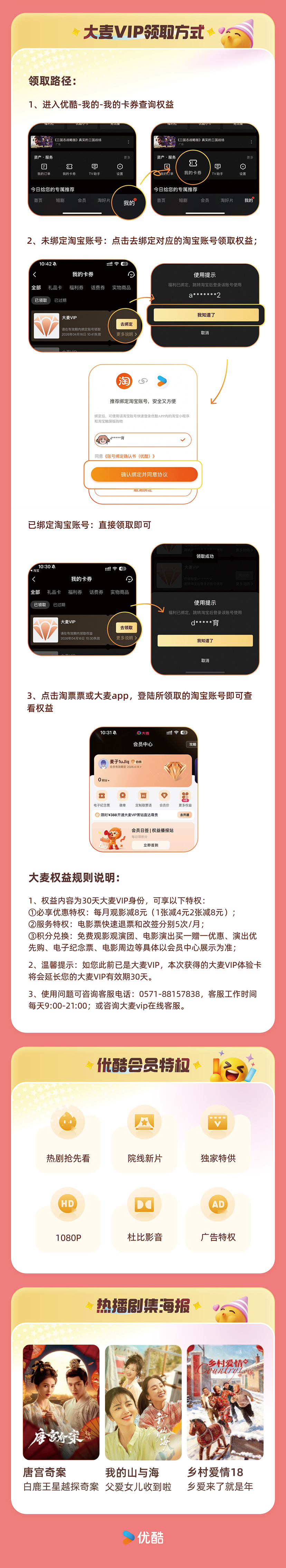 1、“快乐包”用户在成功领取“优酷VIP月卡”后,可获得“大麦VIP”领取资格。